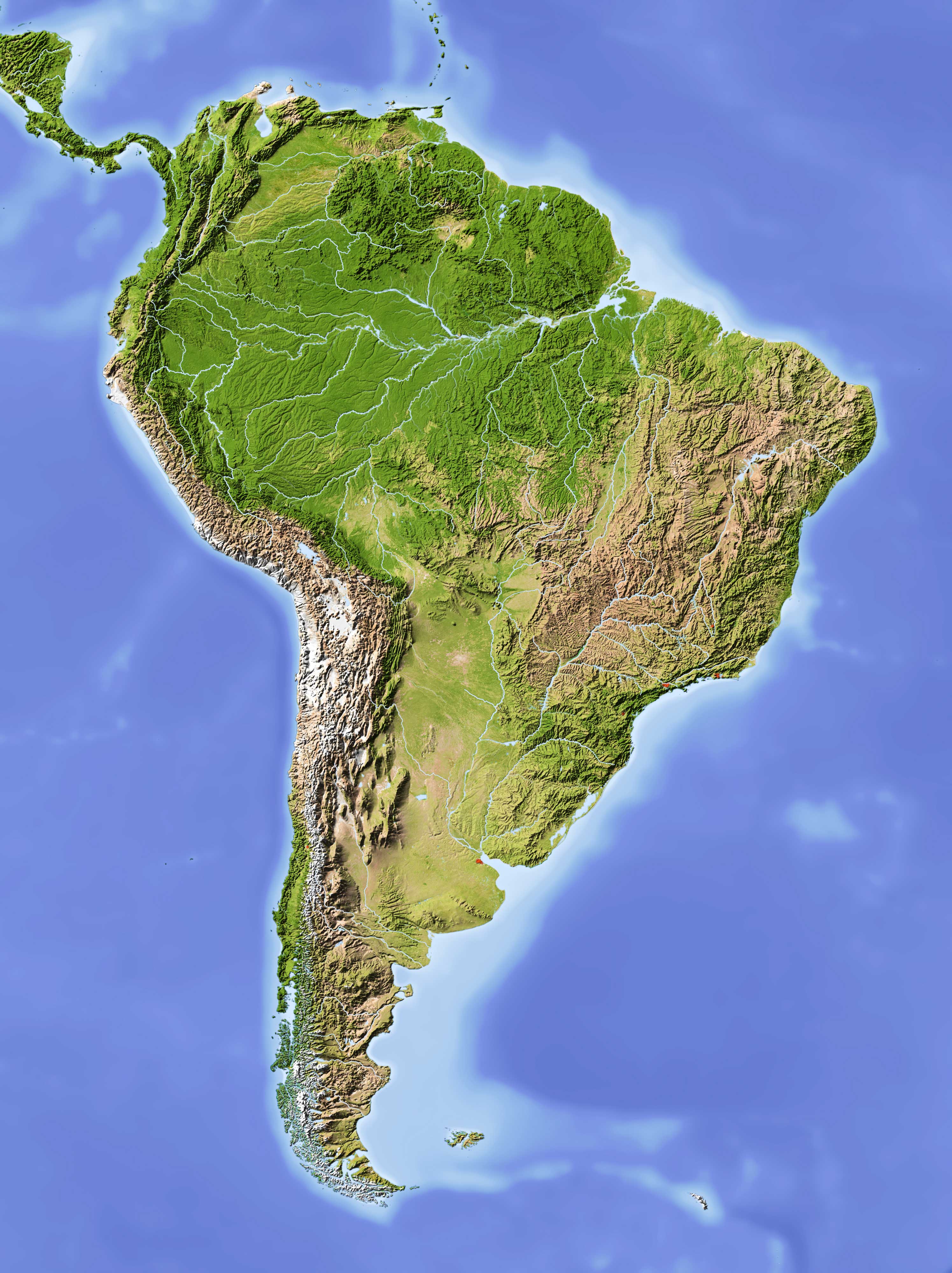 A 3D representation of South America's terrains, capturing the physical landscape in remarkable detail.