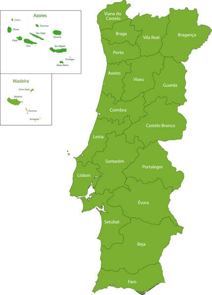 Green Portugal map with regions.