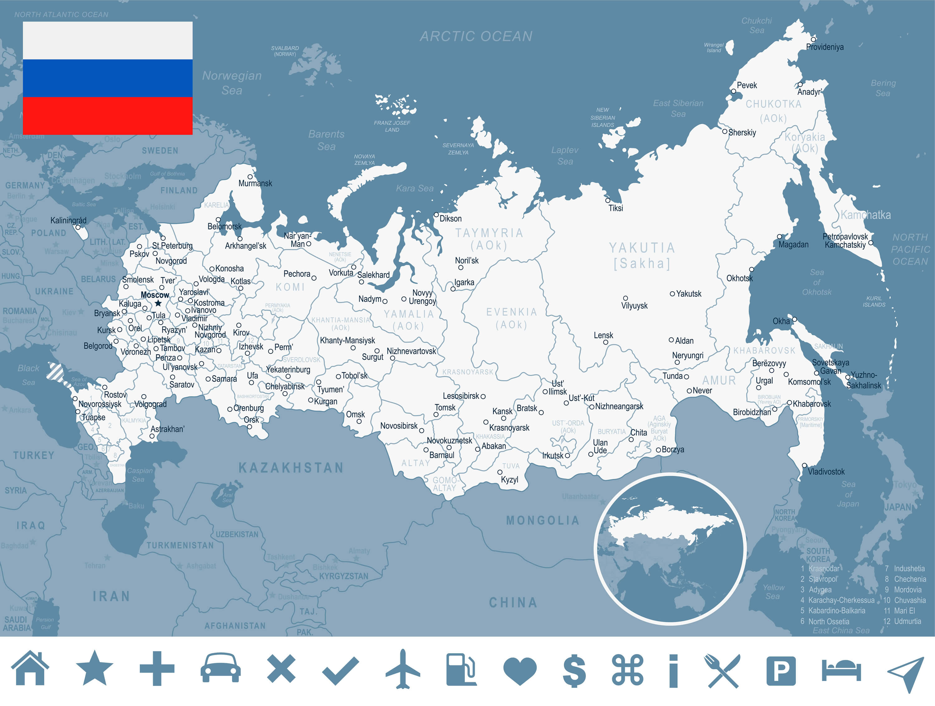 Russia Travel Map with with touristic destinations. Russia map and flag - highly detailed vector illustration