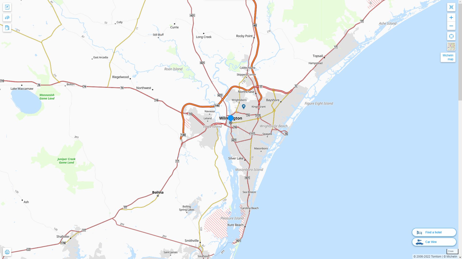 Navigate Wilmington, North Carolina Map, map of Wilmington, Wilmington North Carolina regions map, Wilmington satellite image, towns map, road map of Wilmington.