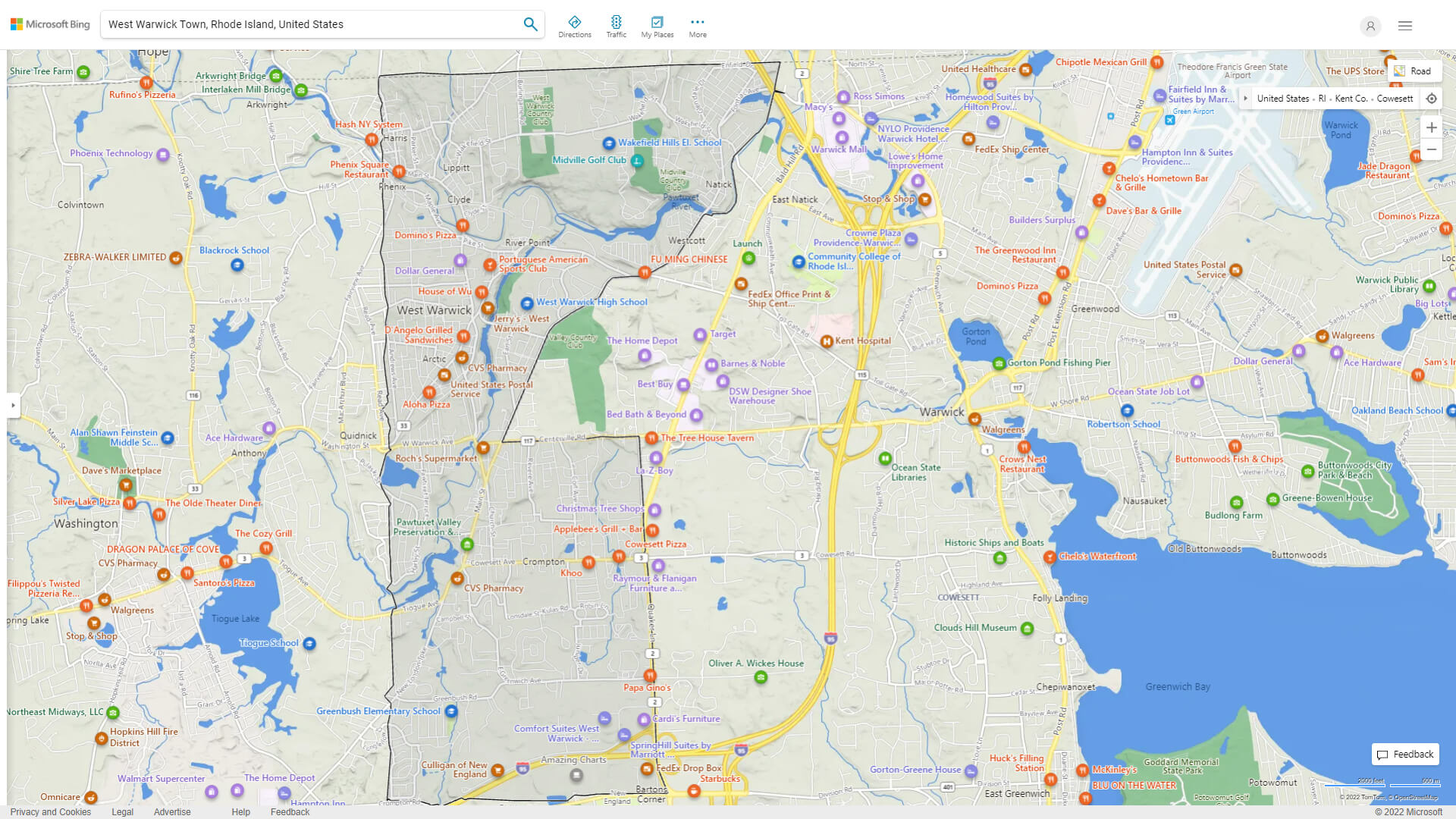 Navigate West Warwick Town, Rhode Island Map, map of West Warwick Town, West Warwick Town Rhode Island regions map, West Warwick Town satellite image, towns map, road map of West Warwick Town.