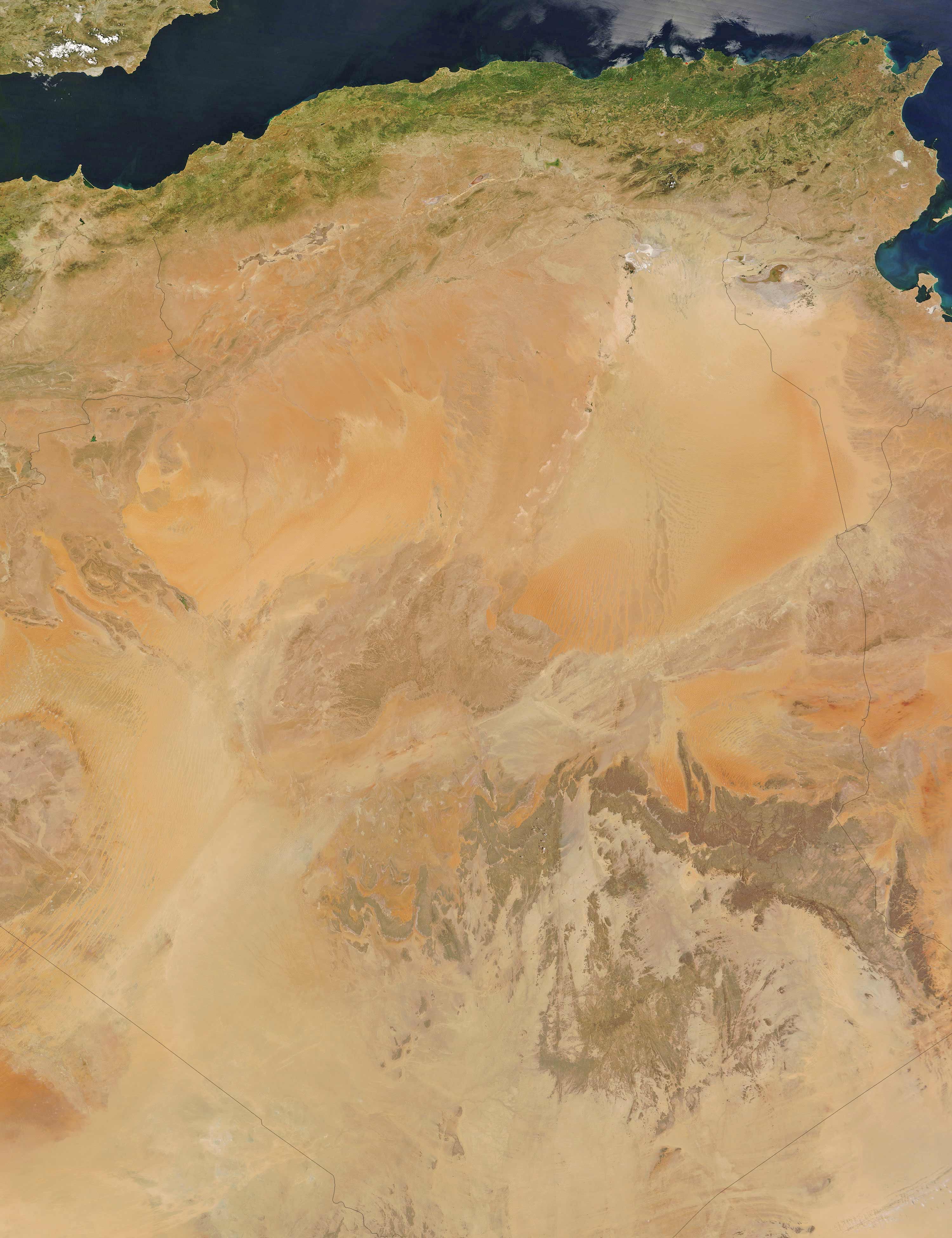 This stunning view captures Algeria's terrain and topography from space, offering a breathtaking snapshot of its natural beauty from the stars.