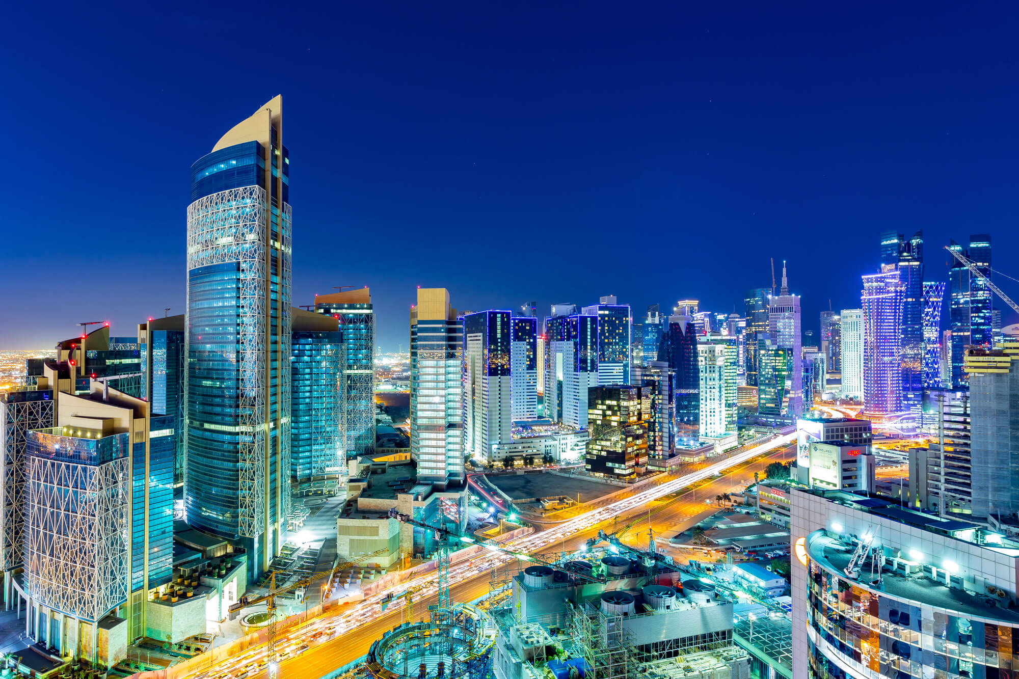 DOHA, QATAR - NOV 22: The skyline panorama of the West Bay area of Doha at dusk on November 22, 2016 in Doha, Qatar. The West Bay is considered as one of the most prominent districts of Doha.