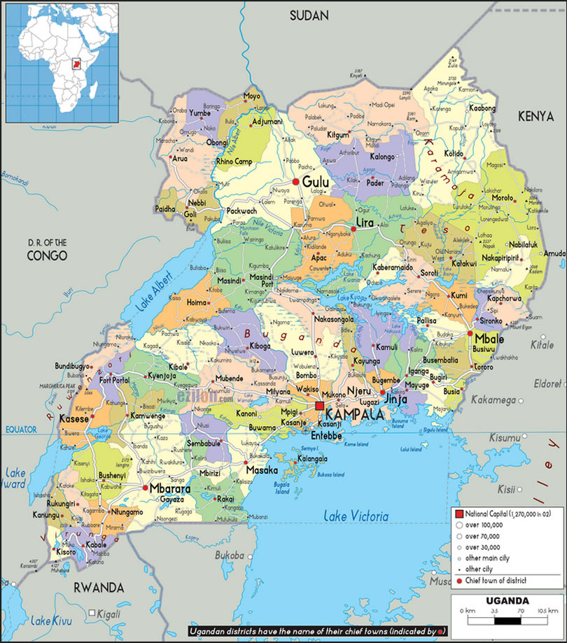 Uganda has a population of 35,873,253 people, Uganda's capital city is Kampala and largest city Kampala.